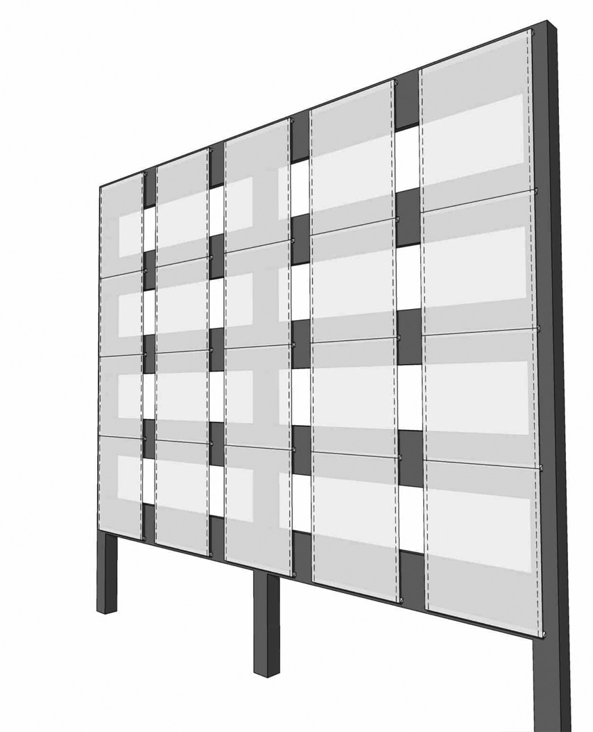 Our FlexFacades Stretch Panel Screens are a cost-effective solution for rectangular panels. These panel screens are secured horizontally (top and bottom only). This design allows for vertical gaps between screens to aid in additional ventilation and does not require added vertical structure when spanning vertically. This solution mimics how metal mesh is tensioned vertically and naturally, and may have slight waves in the mesh. Note: If you do not want this aesthetic, you may want to check out our more expensive FlexFacades Modular Panels, which are framed on all four sides to create a perfectly flat panel.
